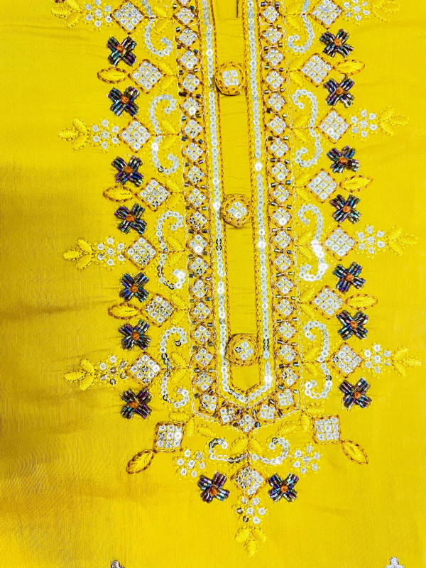 mustard-yellow hue, adorned with intricate embroidery and hand
