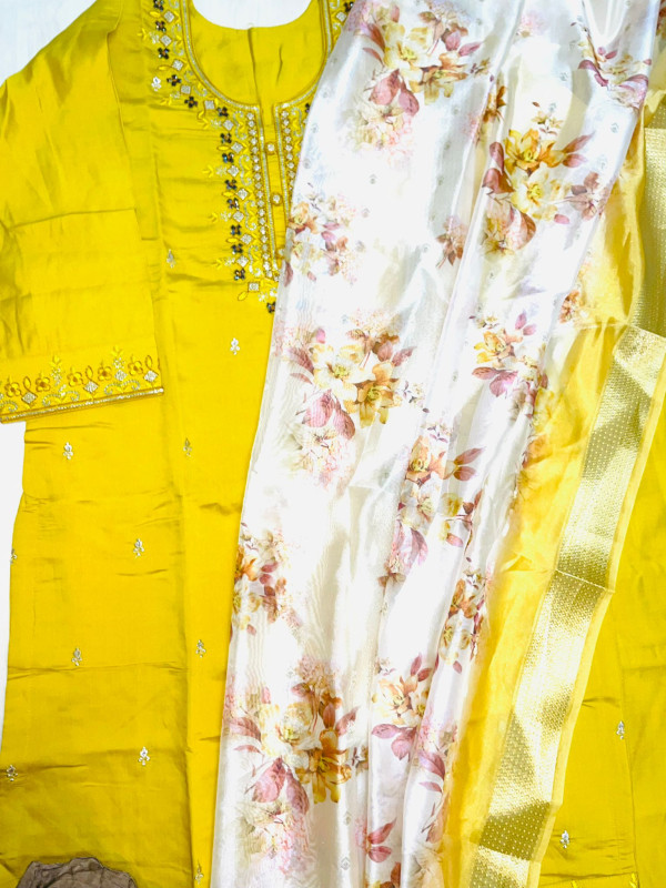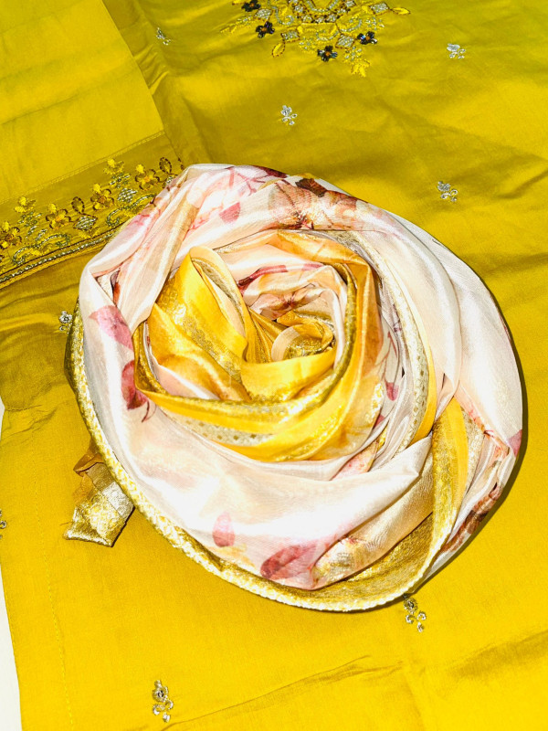 mustard-yellow hue, adorned with intricate embroidery and hand